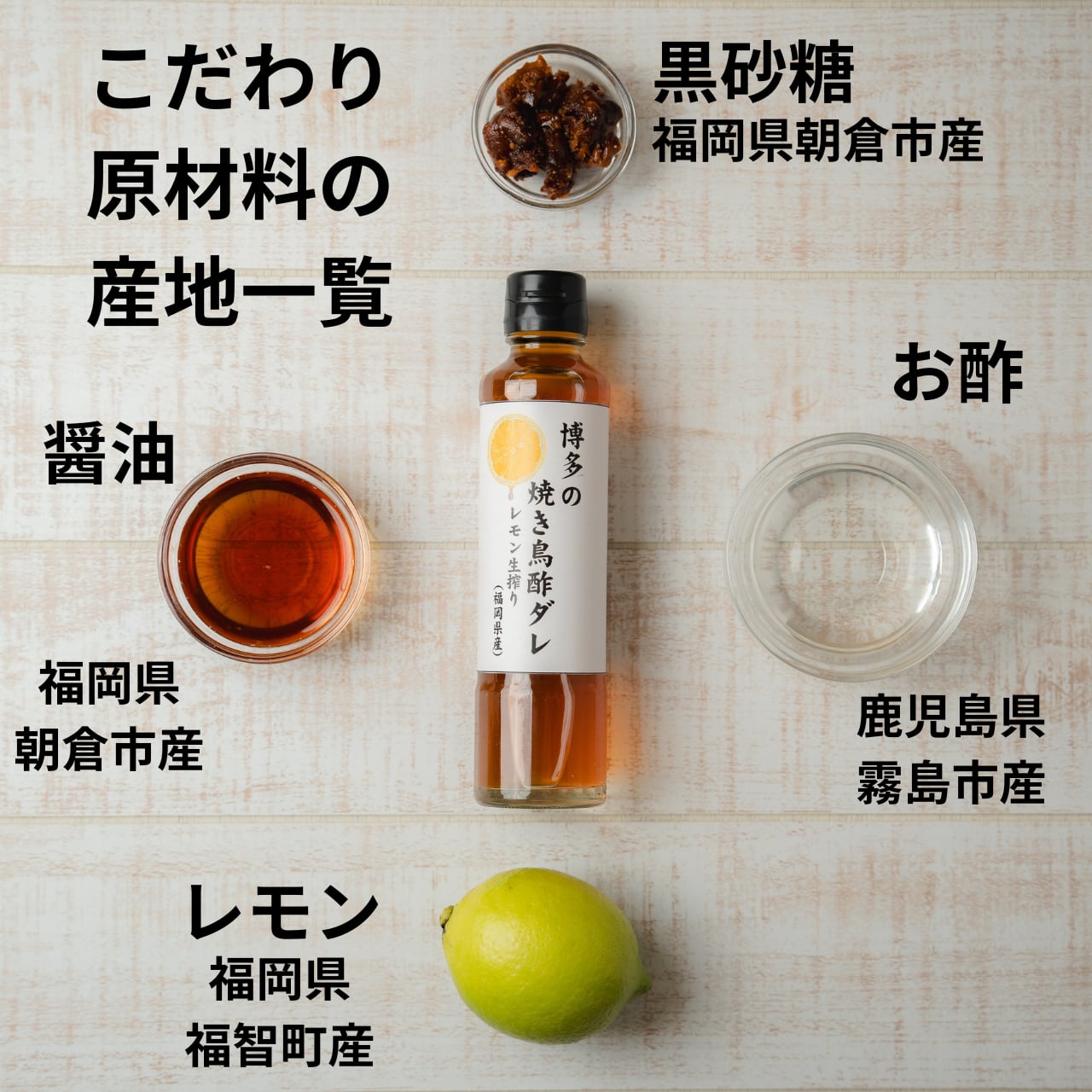 【原材料名】醸造酢(鹿児島県産)、薄口醬油(福岡県産)、レモン果汁(福岡県産)、黒砂糖(福岡県産)